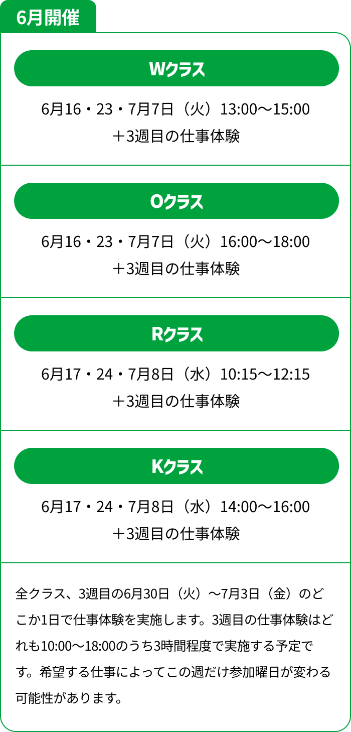 ※希望数などの状況により、希望したクラスや仕事体験先にはならないことがありますのでご理解の上ご参加ください。