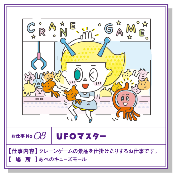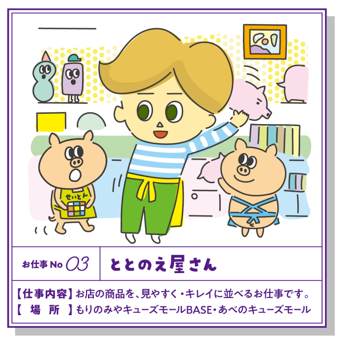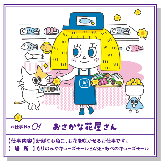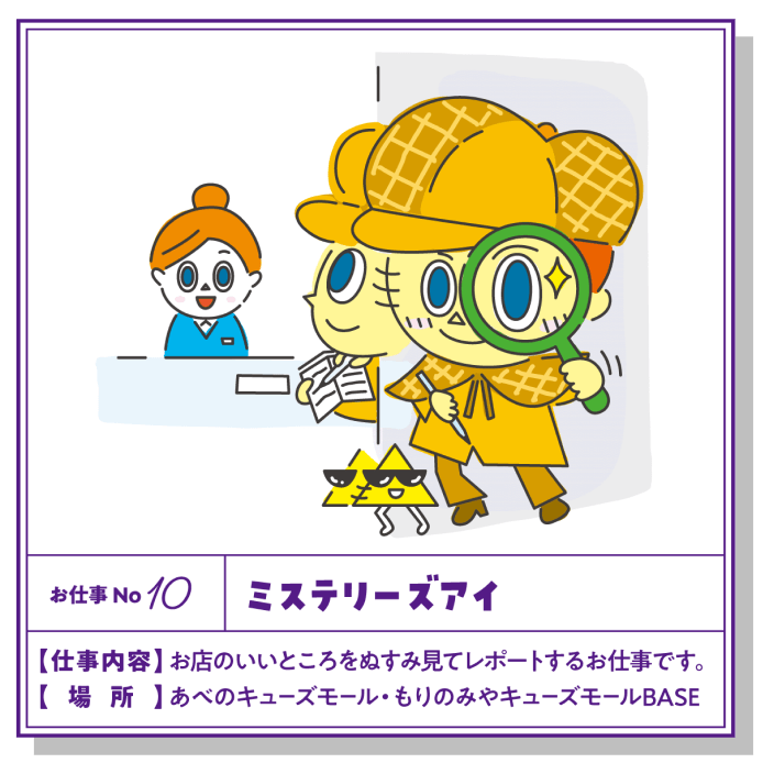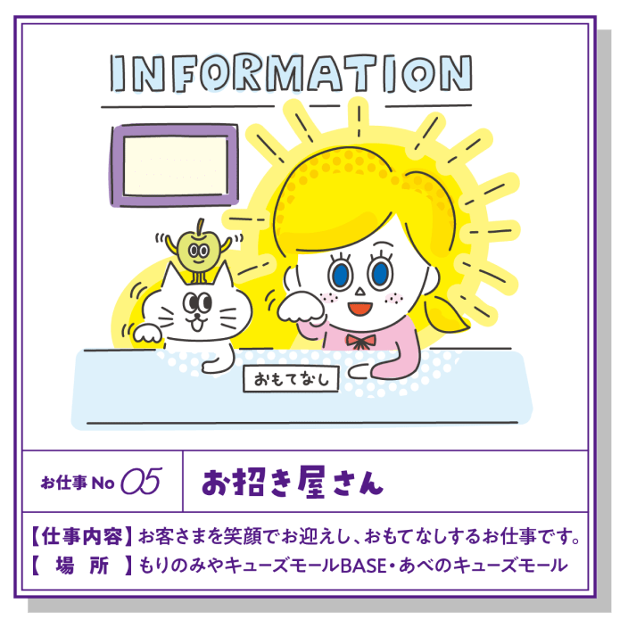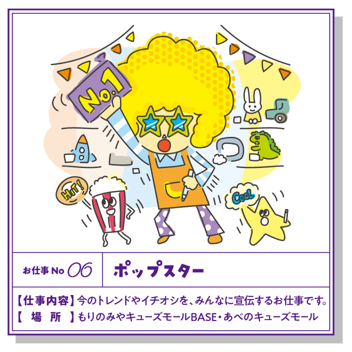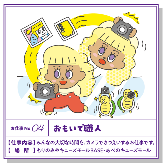 あべのキューズモール・もりのみやキューズモールBASEで働く大人と一緒に、本物の仕事にチャレンジできます。お店だけでなく、はたらくフリースクールのプロモーション動画撮影や、キューズモールの運営に関わる仕事も登場予定です。